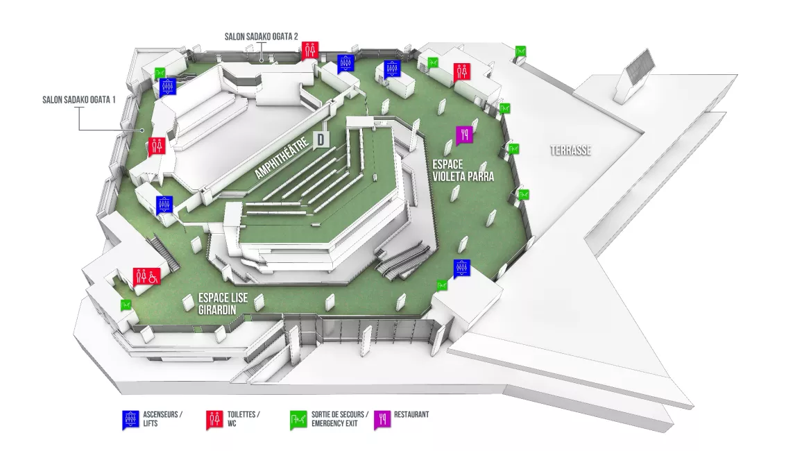 Amphitheater D is a spacious and functional conference space, offering over 800 seats across an area of 1,426 m². Located on the first floor of the building, it provides the perfect setting for large-scale conferences, combining comfort, modernity, and professionalism.
